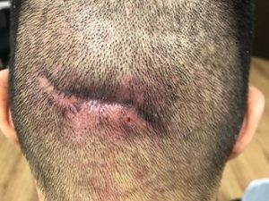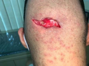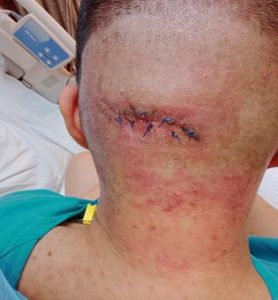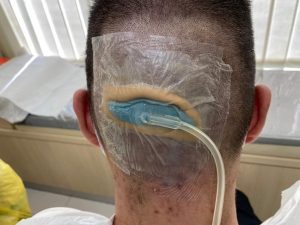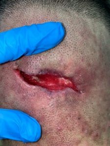 A 30-year-old male patient was referred to our clinic for wound management on 9 February 2021 following saucerization of scalp abscess done on 19 January 2021. There was slow progression in wound healing despite wound dressing done twice a week in the surgeon’s clinic since operation. The patient was also receiving chemotherapy treatment for recurrent cancer of the colon. Chemotherapy was discontinued due to the development of the scalp abscess and subsequent surgery. There was therefore an urgent need for wound healing to be expedited in order to resume his chemotherapy treatment.