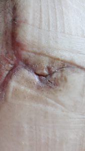 Initial SNAP therapy: SNAP therapy begun 17.11.19. The sterile field was prepared, proceeding with irrigation using Prontosan with a 30cc syringe and a 20G cannula needle.  We covered the wound with TNT gauze using anatomical tweezers. Then we added polyurethane foam shaped to match the wound bed. A protective product was applied to the perilesional skin and then we applied polyurethane film on the wound sealing it with medication (SNAP TM hydrocolloid)