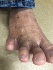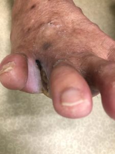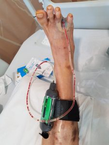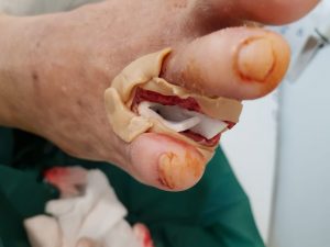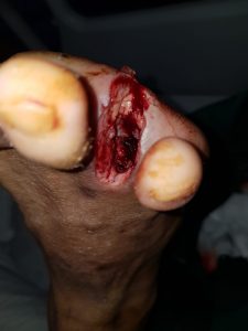 Mr N is a 45 year old Chinese gentleman with a medical history of diabetes mellitus, hypertension, hyperlipidemia, peripheral artery disease, and is an ex-smoker. He developed an infected ulcer over his right 4th toe and underwent right lower limb angioplasty followed by 4th toe ray amputation on 21/12/18. The wound measured 3.2 (length) x 1.3 (width) x 2.0cm (depth) with exposed bone. The 3MTM SNAPTM therapy system was chosen for its slim trackpad design that can fit between the toes – in contrast, the conventional V.A.C system will require a bridging foam landing zone to accommodate for the broader trackpad. As our patient was young and independent, comfort and the ability to resume his daily activities were important to him – these factors were taken into consideration when choosing the SNAPTM therapy system for its ultra-portable, lightweight and quiet design that can be easily hidden under clothes.